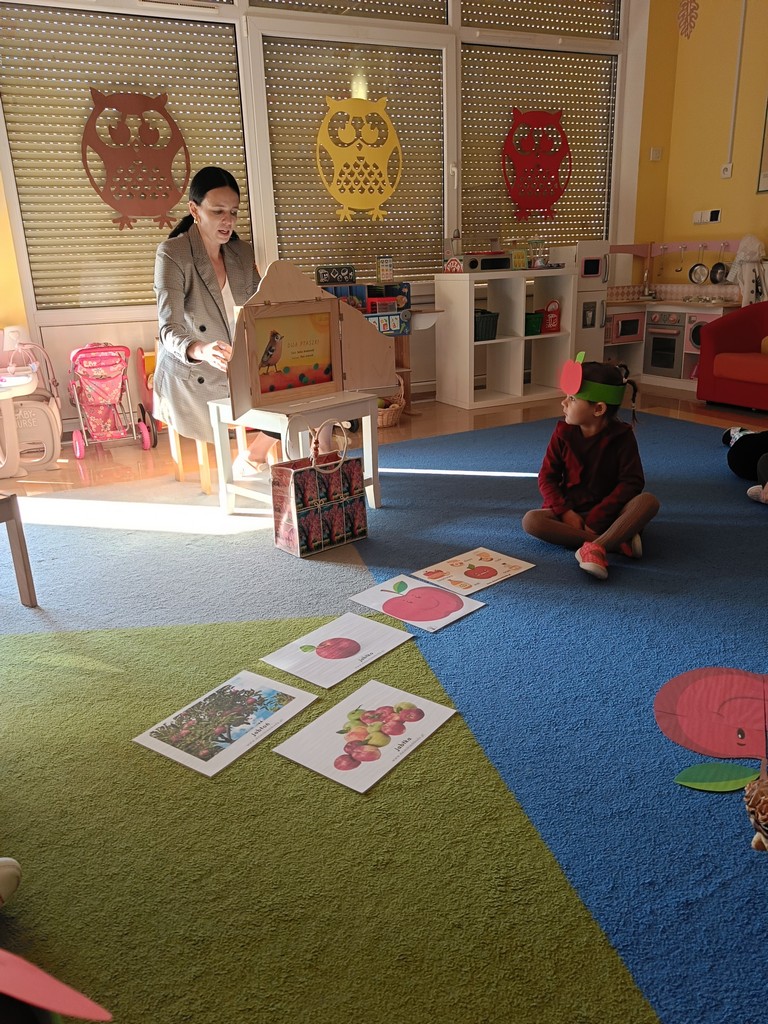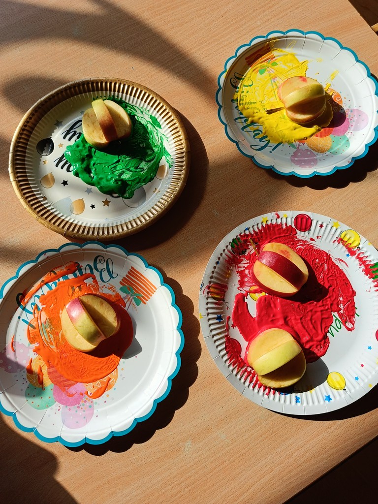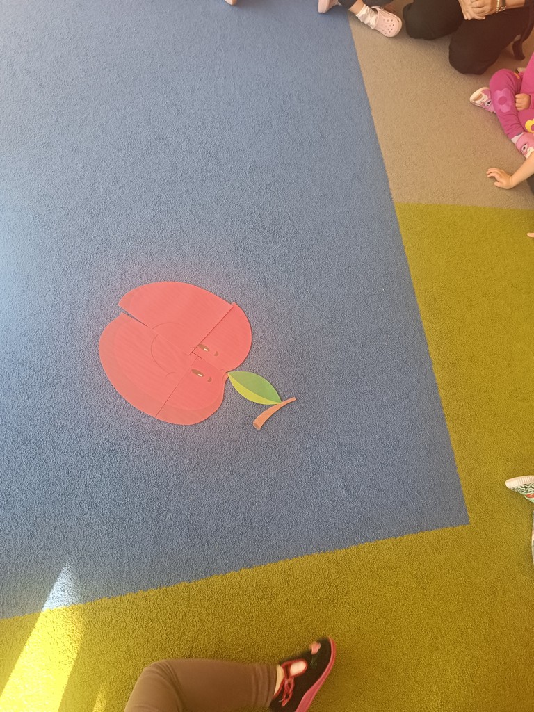 Poniedziałek 29 września 2025r. w grupie Misie był wyjątkowym dniem. Przedszkolaki świętowały Dzień Głośnego Czytania oraz Dzień Jabłka. Dzień Jabłka rozpoczął się od wykonania kolorowych opasek z jabłuszkiem dla każdego dziecka, następnie dzieci dowiedziały się, skąd pochodzą jabłka i dlaczego są zdrowe, wspólnie obejrzeliśmy film edukacyjny „Od kwiatuszka do jabłuszka”. Przedszkolaki wykonały pracę plastyczną „Jabłkowy kompot” oraz mogły spróbować pieczonych jabłek, które w tym dniu przygotowały panie kucharki. Po smacznej przekąsce odwiedziła naszą grupę Pani Justyna Maksymiuk- Bednarz kierownik Miejskiej Biblioteki Publicznej w Chojnie z okazji Dnia Głośnego Czytania. Dzieci w ciszy i z uwagą słuchały czytanych przez gościa bajek. Oprócz książek Pani Justyna przyniosła i zaprezentowała dzieciom teatrzyk kamishibai pt. „Dwa Ptaszki”. Dzień upłynął w radosnej atmosferze. Dziękujemy Pani Justynie za poświęcony czas.