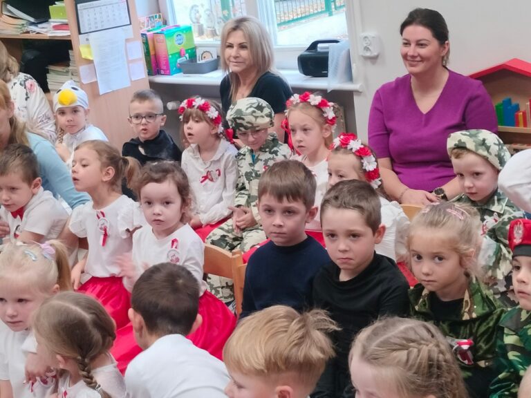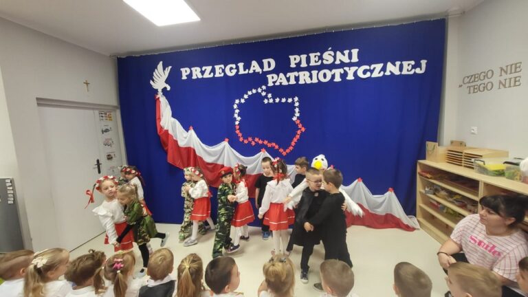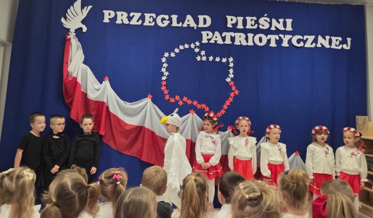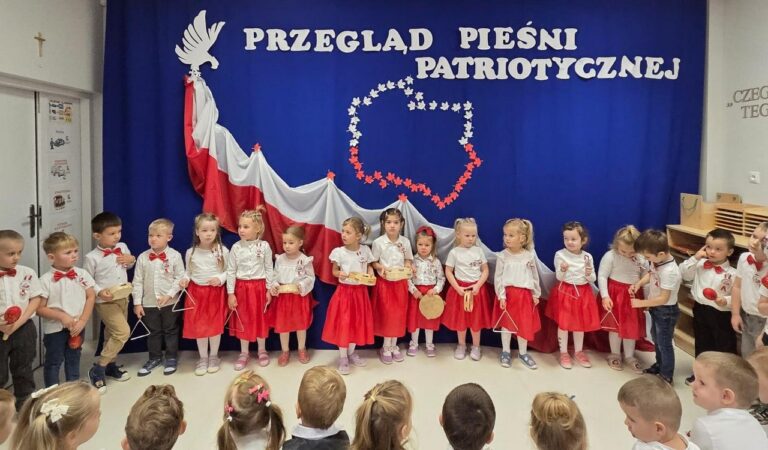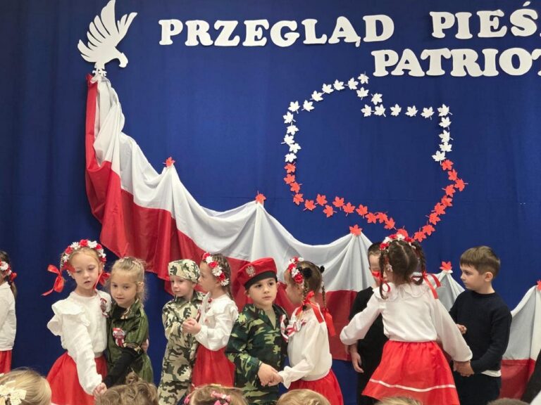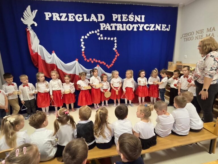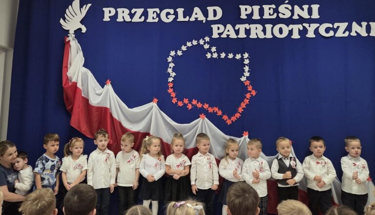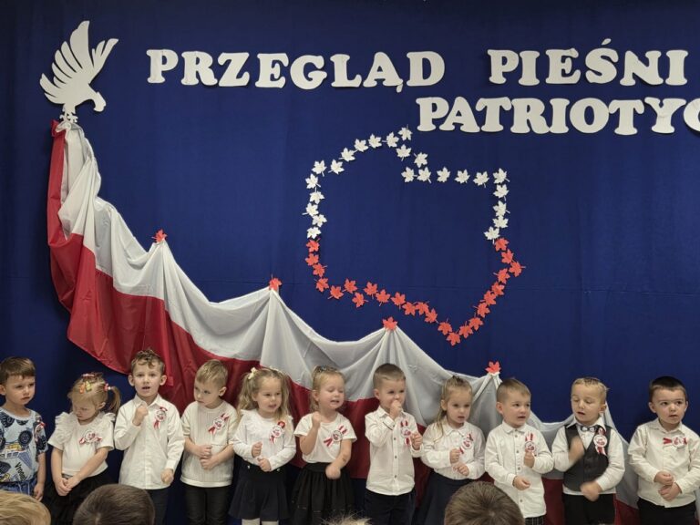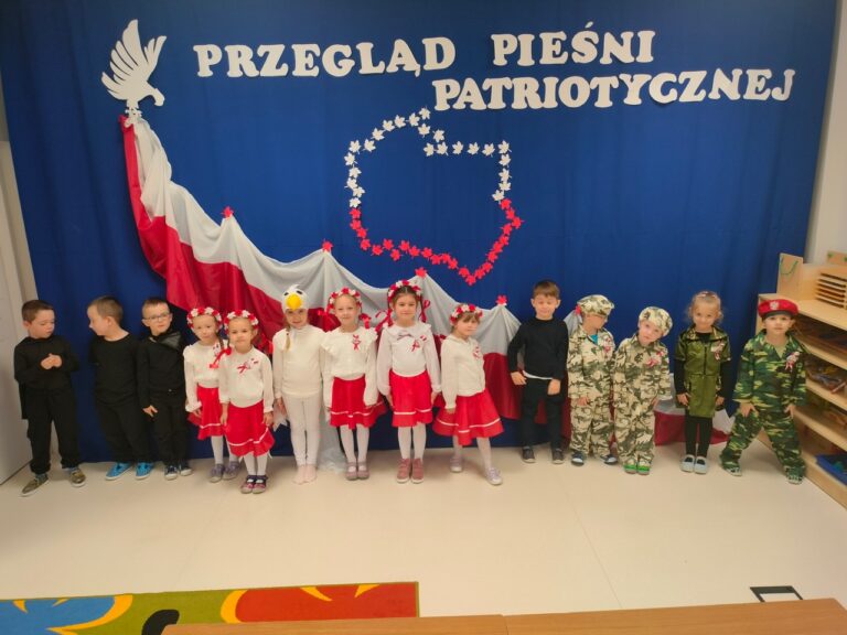 Dnia 04.11.2025r. w przedszkolu przy ul. Gen. Wł. Sikorskiego 25 odbył się Przegląd Pieśni Patriotycznej. Celem tego konkursu była popularyzacja pieśni patriotycznych, rozwijanie zainteresowań muzycznych oraz kształtowanie postaw szacunku i miłości do Ojczyzny. W konkursie wzięły udział dzieci z grupy ,,Stokrotki”, ,,Słoneczka” i ..Jeżyki”. Swoją obecnością zaszczycili nas także podopieczni Środowiskowego Domu Samopomocy w Chojnie. Gospodarze tego spotkania – grupa Jeżyki zaprezentowała się w przepięknej opowieści o Białym Orle i zdobyła za to ogromne brawa. Natomiast najmłodsza grupa, ,,Stokrotki’’ zaprezentowała się w piosence pt.,, Złota trąbka” a grupa ,,Słoneczka” w utworze pt.,, Jaki piękny kraj” wykorzystując przy tym instrumenty perkusyjne. Nasi goście także zaśpiewali nam pieśń patriotyczną-,, Przybyli ułani pod okienko”. Przedszkolaki z wielkim zainteresowaniem słuchały pieśni patriotycznych, a Biały Orzeł, który wręczał wszystkim flagi Polski, na pewno na długo zostanie w ich pamięci. W tym miejscu serdecznie dziękujemy wszystkim rodzicom, za przygotowanie przepięknych strojów dzieciom.