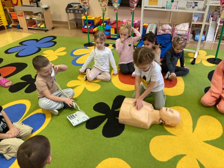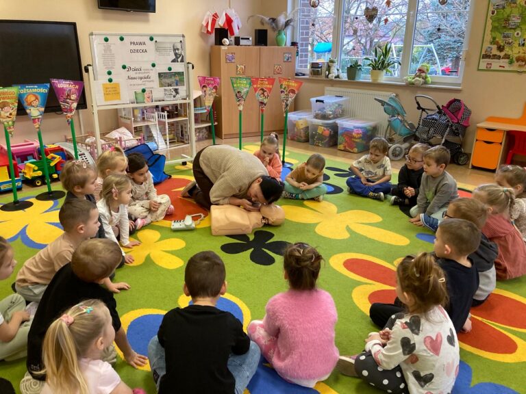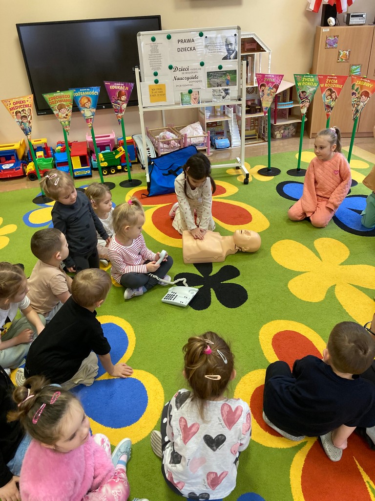 W dniu 20 listopada 2025r. w naszej grupie tematem przewodnim wszystkich zajęć i zabaw były zagadnienia dotyczące Praw Dziecka. Od samego rana dzieci poznawały wybrane prawa i oswajały się z ich tematyką. Proponowane zabawy miały na celu kształtowanie tolerancyjnych zachowań, dostrzeganie potrzeb innych oraz budowanie empatii. Żabki uświadomiły sobie, że w ich otoczeniu są osoby, do których mogą zwrócić się o pomoc. Dowiedziały się, że jeśli ma się do czegoś prawo, to ma się też obowiązek. Jednym z praw dziecka jest prawo do opieki medycznej. W związku z tym dzieci z naszej grupy uczestniczyły w zajęciach z Fantomem. Uczyły się podstawowych działań wchodzących w zakres pierwszej pomocy przedmedycznej. Żabki wykazały się wiedzą, gdzie otrzymać pomoc w danej sytuacji oraz znajomością numerów telefonów alarmowych. Dzieci podczas zajęć podejmowały próby wykonywania resuscytacji krążeniowo-oddechowej na fantomie. Podsumowaniem zajęć było wspólne wykonanie plakatu pt. „Prawa dziecka”. Był to bardzo ciekawy i emocjonujący dzień dla nas wszystkich.