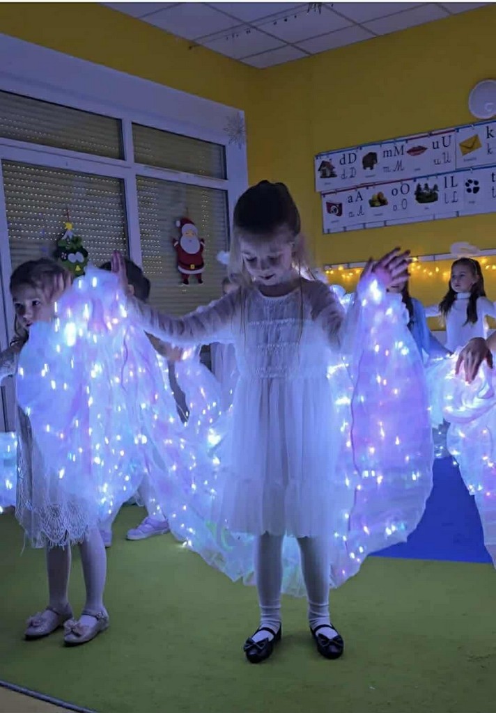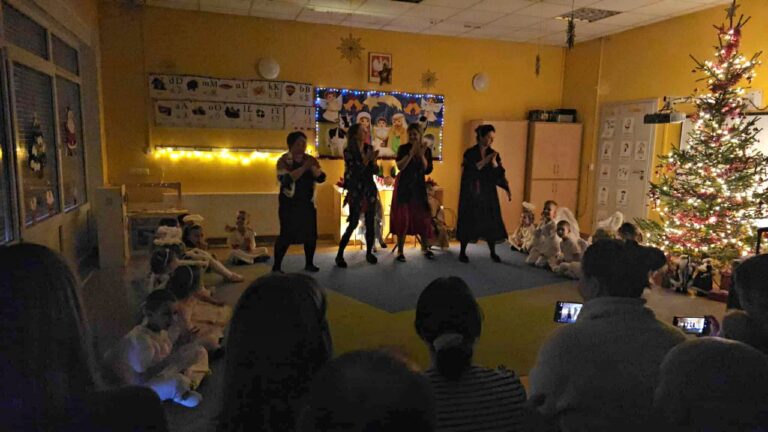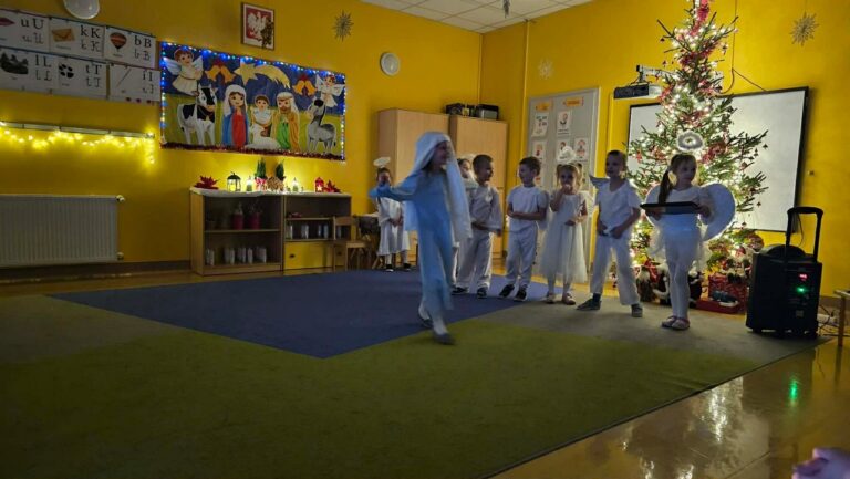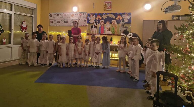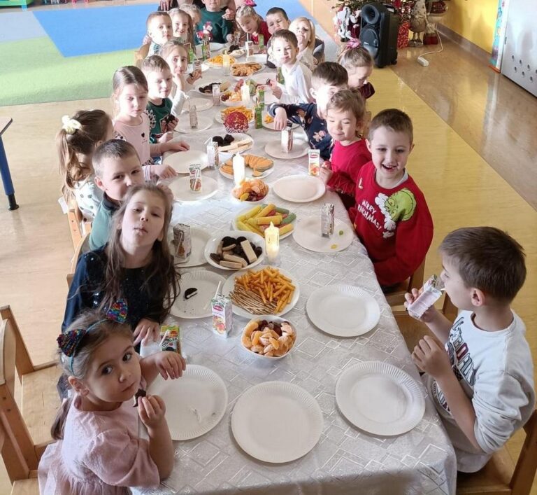 W dniu 17 grudnia 2025r. przedszkolaki z grupy „Muchomorki” przygotowały dla swoich rodziców występ nawiązujący tematyką do zbliżających się Świąt Bożego Narodzenia. W pięknie udekorowanej sali, przy dźwiękach kolęd i pastorałek, dzieci wraz z najbliższymi z radością i przejęciem przeżywały magię nadchodzących Świąt. „Muchomorki” z wielką radością i przejęciem zaprezentowały się przed swoimi rodzicami, dzieląc się świątecznym przesłaniem miłości i dobroci. Występ był niezwykle wzruszający i dostarczył wielu pięknych emocji. Natomiast 18 grudnia 2025r. w grupie odbył się świąteczny poczęstunek. Przy wspólnym stole panowała serdeczna atmosfera. Dzieci z entuzjazmem uczestniczyły w tym wyjątkowym spotkaniu, składając sobie świąteczne życzenia oraz dzieląc się dobrym słowem. Podczas poczęstunku przedszkolaki śpiewały kolędy i rozmawiały o świątecznych tradycjach, ucząc się wzajemnej życzliwości, empatii oraz wartości bycia razem. Był to czas pełen uśmiechów i ciepła, który na długo pozostanie w pamięci dzieci.